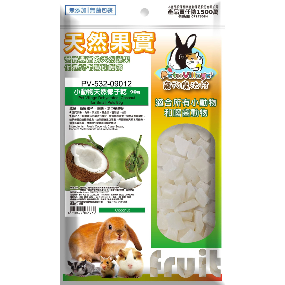 小動物天然椰子乾 30g/90g 成分: 椰子 蔗糖 適用對象:兔子、天&鼠、 金鼠 、 寵物鼠 、松鼠 防止人工飼責無法供給多元食材·所造成的營養不均衡及季節變化 給予毎日自由攝取食, 並無回食量之限制·保留豊富天然水果養分