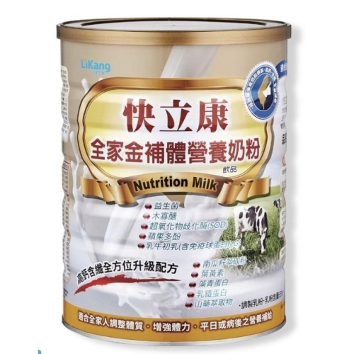 全方位升級配方 調整體質:乳牛初乳(含免疫球蛋白lgG)、乳鐵蛋白、藻青蛋白、山藥萃取物、南瓜籽萃取粉。 活力因子:穀類醱酵物(含超氧化物歧化酶SOD)、蘋果多酚。 體內環保:綜合益生菌、木寡醣、含膳食纖維。【商品特色】 採用紐西蘭純淨無汙染的奶粉調製而成,在優質的奶粉中,規劃高鈣配方及添加各種營養因子,幫助牙齒骨骼正常發育、調節生理機能、促進食慾、滋補強身、養顏美容,適合全家大小營養補給的飲品。   全方位升級配方 調整體質:乳牛初乳(含免疫球蛋白lgG)、乳鐵蛋白、藻青蛋白、山藥萃取物、南瓜籽萃取粉。 活力因子:穀類醱酵物(含超氧化物歧化酶SOD)、蘋果多酚。 體內環保:綜合益生菌、木寡醣、含膳食纖維。   【商品規格】 ●容量:1600g/罐 ●成分:全脂奶粉(45%)、植物油粉(葡萄糖漿、棕櫚油、乾酪素鈉、脂肪酸甘油脂、磷酸氫二鉀、二氧化矽、香料、乳酸硬脂酸鈉、單及雙脂肪酸甘油、二乙醯酒石酸脂、β-胡蘿蔔素)、麥芽糊精、脫脂奶粉(10%)、果糖、菊糖、香料、綜合礦物質(碳酸鈣、焦磷酸鐵、葡萄糖酸鋅、本多酸鈣、葡萄糖酸銅、碘化鉀)、二氧化矽、綜合維生素(維生素C、維生素E、菸鹼醯胺、維生素A、維生素D3、維生素B12、維生素B1、維生素B2、維生素B6、維生素K1、葉酸、生物素)、玉米澱粉、酪蛋白水解物(含酪蛋白磷酸胜肽CPP)、穀類醱酵物(含超氧化物歧化酶SOD)、乳牛初乳(含免疫球蛋白IgG)(50%)、山藥萃取物、高山被孢黴發酵產物(含花生四烯酸AA) 、金盞草萃取物(含葉黃素)(0.5%)、L-麩醯胺酸、南瓜籽萃取粉、銀杏果粉、鉻酵母、硒酵母、乳鐵蛋白、牛磺酸、木寡醣、乳糖、藍藻粉(含藻青蛋白)(2.1%)、蘋果萃取物(含蘋果多酚)(33%)、乳酸菌-ABCL(鼠李糖乳酸桿菌、嗜酸桿菌、雙叉桿菌、龍根菌)、綜合蔬果抽出物(鳳梨萃取物、糖化酵素、纖維分解酵素、青木瓜萃取物)。   ●過敏原資訊:本產品含牛奶、大豆、含麩質之穀物、種子類及其製品,對其過敏者請留意。 ●食用方式:每次6平匙(約30g),以少量溫開水攪拌,再加入200cc熱開水沖調成一杯,攪拌均勻即可食用,可依個人喜好調整濃度或加入植物奶、麥片、脆片等其它食品一同沖調食用。建議您每日早晚飲用一杯為健康加分。 ●貯存方式:請至於陰涼乾燥處儲存,開封後請蓋緊上蓋注意保存,並建議1~2個月食用完畢,以保持產品品質、風味 ●原產地:台灣 ●乳源進口國:紐西蘭 ●保存期限:以消費者收受日起算,至少距有效日期前600日以上 ●食品業者登錄字號:D-112549828-00000-7   【注意事項】 本產品含有金盞草萃取物、穀類醱酵物(含超氧化物歧化酶SOD)和蘋果萃取物等,若有橘黃色、藍綠色或深褐色等微量粉粒,係屬正常現象,請安心使用。 超商最多二罐