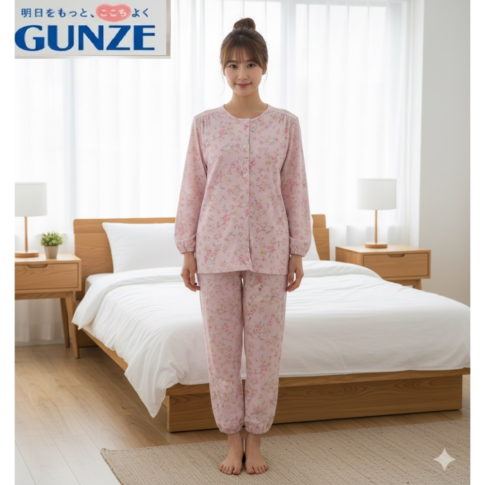日本GUNZE京都捺染 柔滑針織 長袖長褲 女家居睡衣
