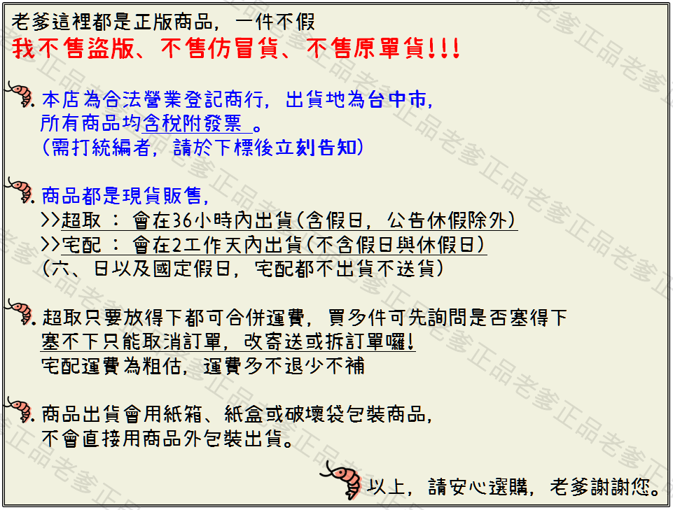 <p><span style="font-weight:bolder&#59;background-color:rgb(255,0,0)&#59;"><font color="#000000"><span style="font-size:16px&#59;">🔯賀搬家,全店滿300限時免運活動中</span><span style="font-size:16px&#59;">~</span></font></span></p><p><span style="font-weight:bolder&#59;background-color:rgb(255,0,0)&#59;"><font color="#000000"><span style="font-size:16px&#59;">🔯賀搬家,全店滿300限時免運活動中</span><span style="font-size:16px&#59;">~</span></font></span></p><p>我是來自友站蝦X的老爹正品,商品搬家複製中,</p><p><span style="font-family:'-apple-system', BlinkMacSystemFont, 'Segoe UI', Roboto, 'Helvetica Neue', Arial, 'Noto Sans', sans-serif, 'Apple Color Emoji', 'Segoe UI Emoji', 'Segoe UI Symbol', 'Noto Color Emoji'&#59;font-size:1rem&#59;">新平台若有庫存錯誤或是功能使用尚不熟悉再請您多多包含。</span></p><p>🔯賀搬家,全店滿299限時免運~</p><p>🔯休假公告 : 無。</p>