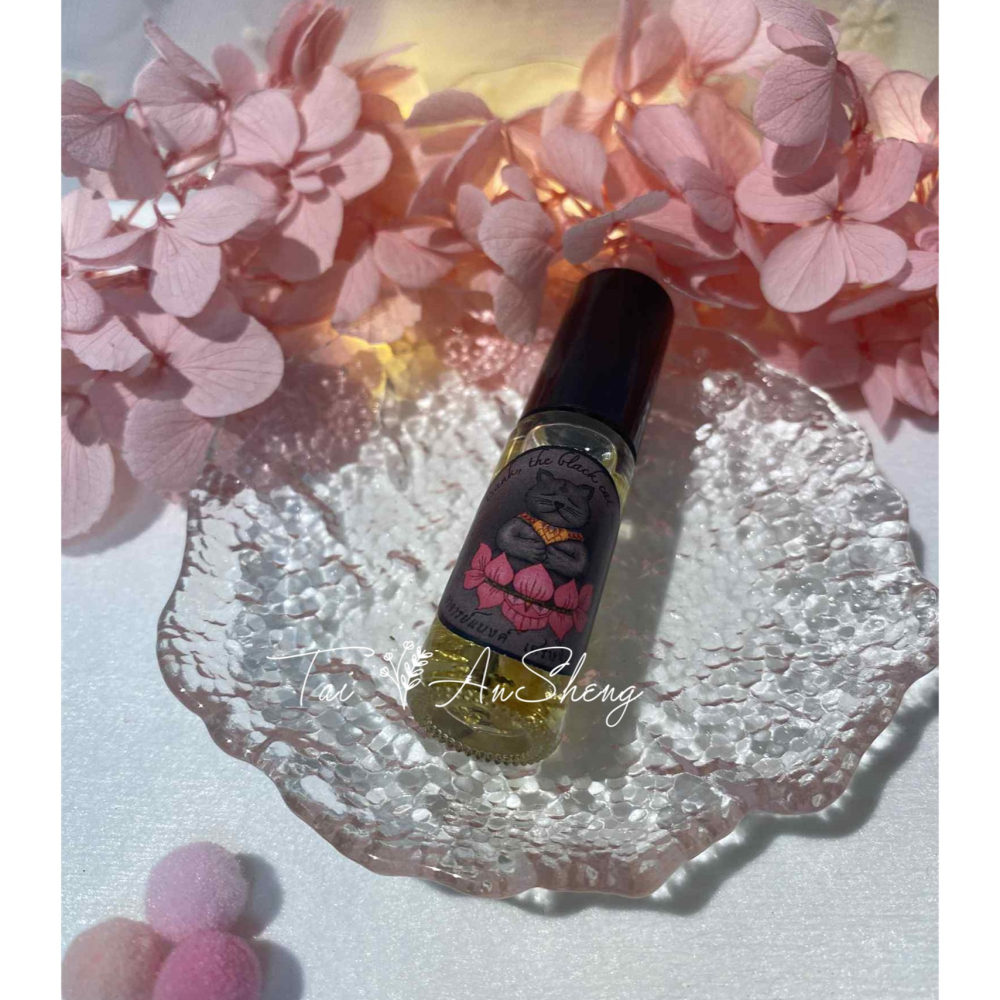 此瓶法油由阿贊班迪以 108 天灣貓舌刺油 加持製成,瓶身刻滿 貓靈跨境吸金符