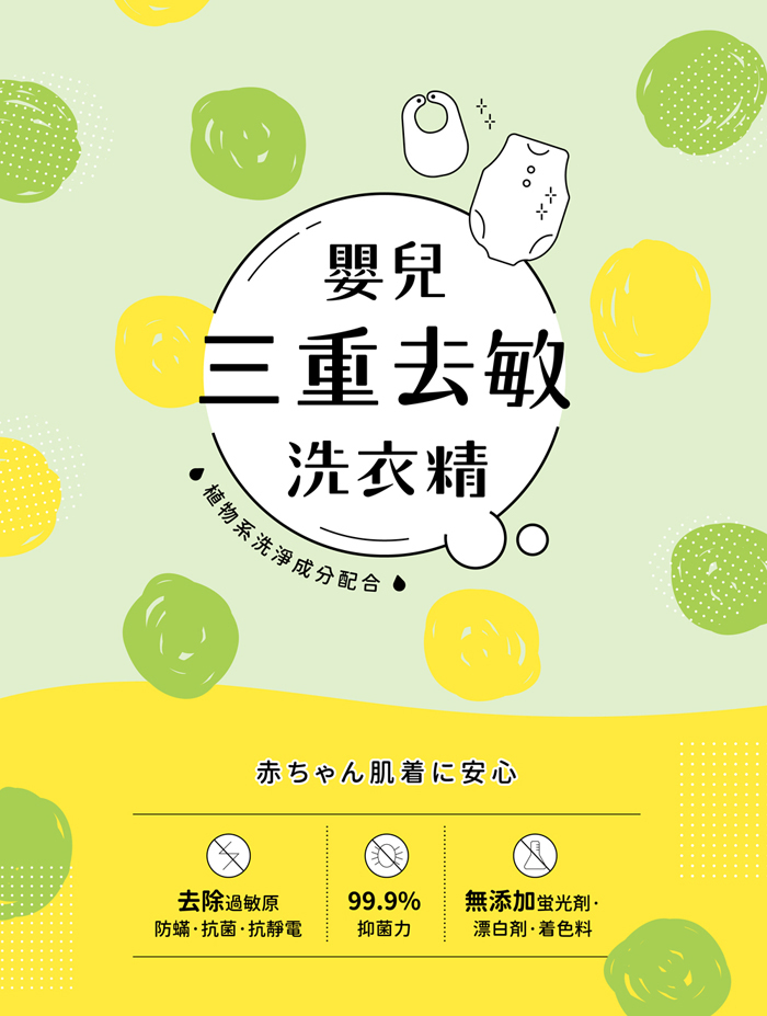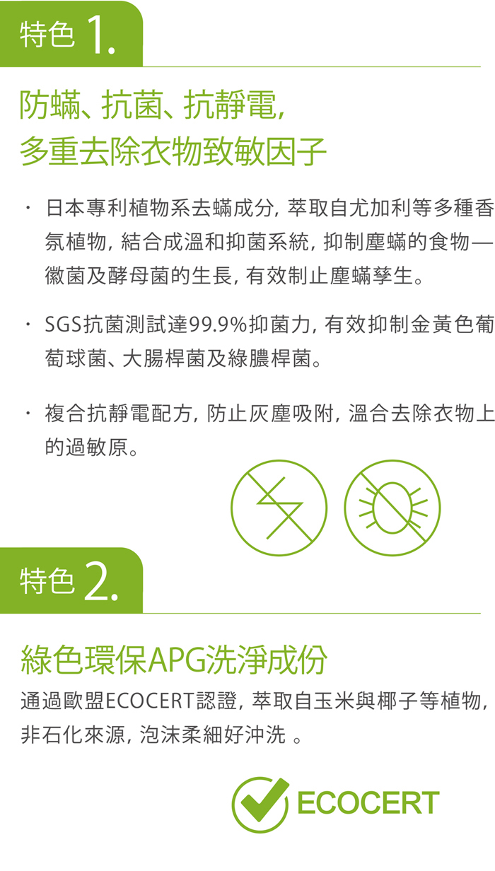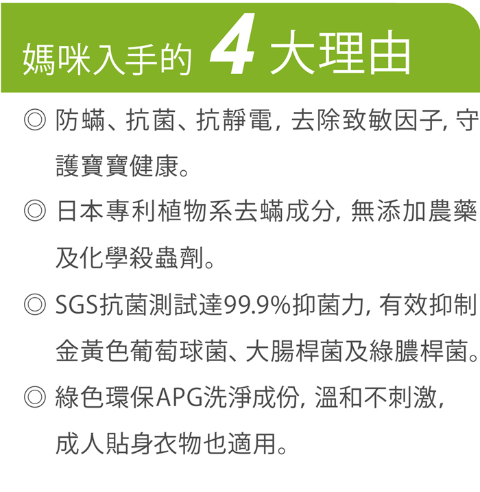 防蟎、抗菌、抗靜電,多重去除衣物致敏因子,守護寶寶肌膚健康。