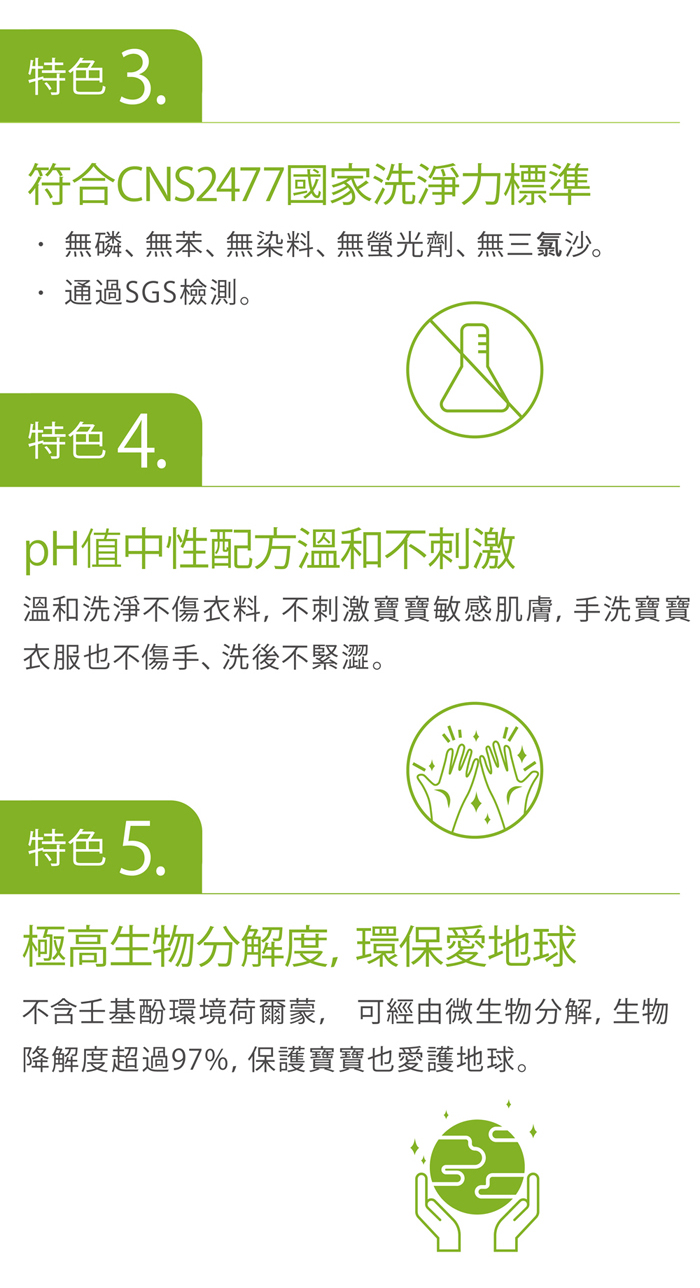綠色環保APG洗淨成份,溫和不刺激,成人貼身衣物也適用。