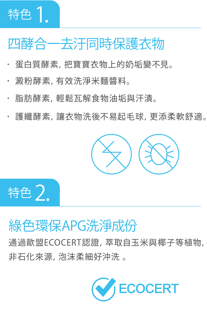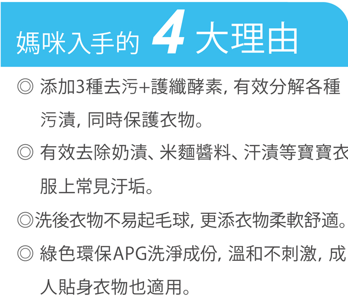 蛋白質、澱粉、脂肪酵素,有效去除奶漬、米麵醬料、汗漬等寶寶衣服上常見汙垢。