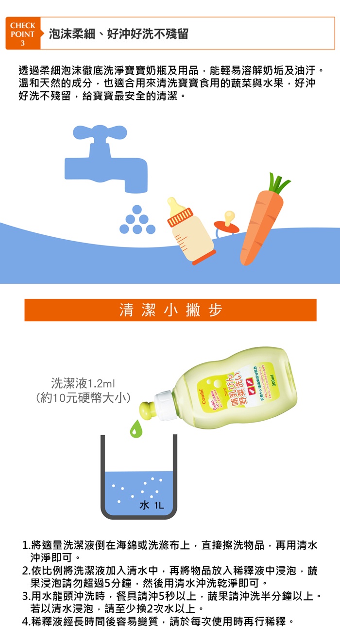 2.依比例將洗潔液加入清水中,再將物品放入稀釋液中浸泡,蔬果浸泡請勿超過5分鐘,然後用清水沖洗乾淨即可。