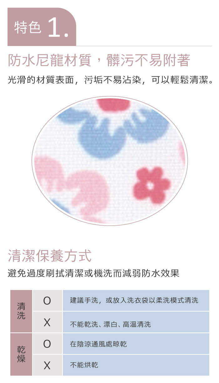 清潔保養方式:避免過度刷拭清潔或機洗而減弱防水效果
