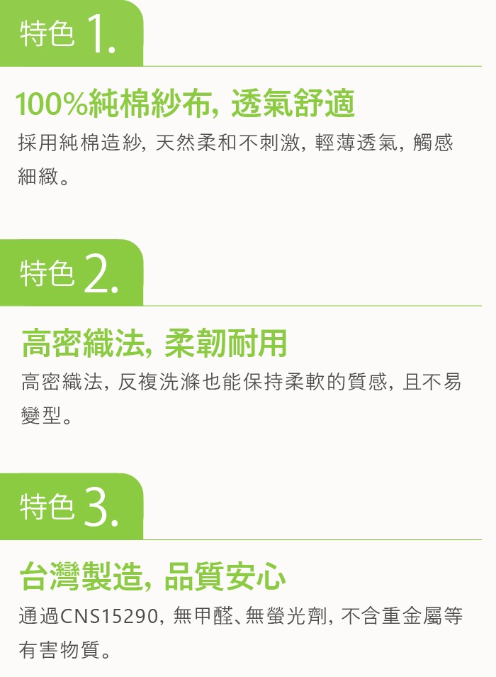 100%純棉紗布。透氣舒適。採用純棉造紗,天然柔和不刺激。