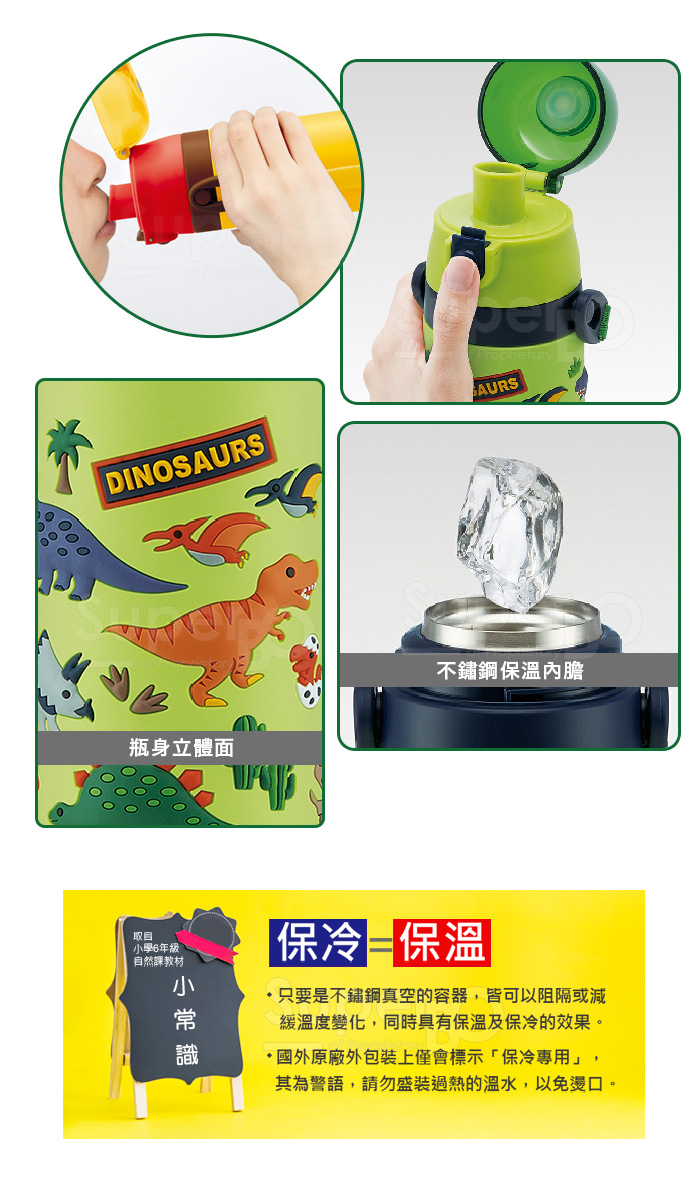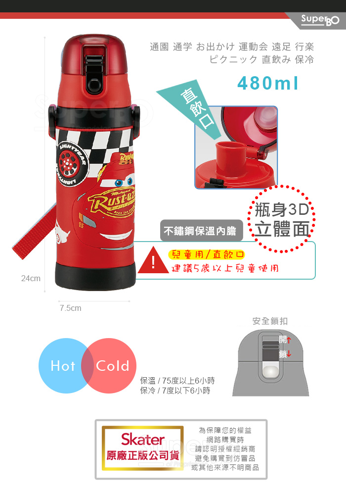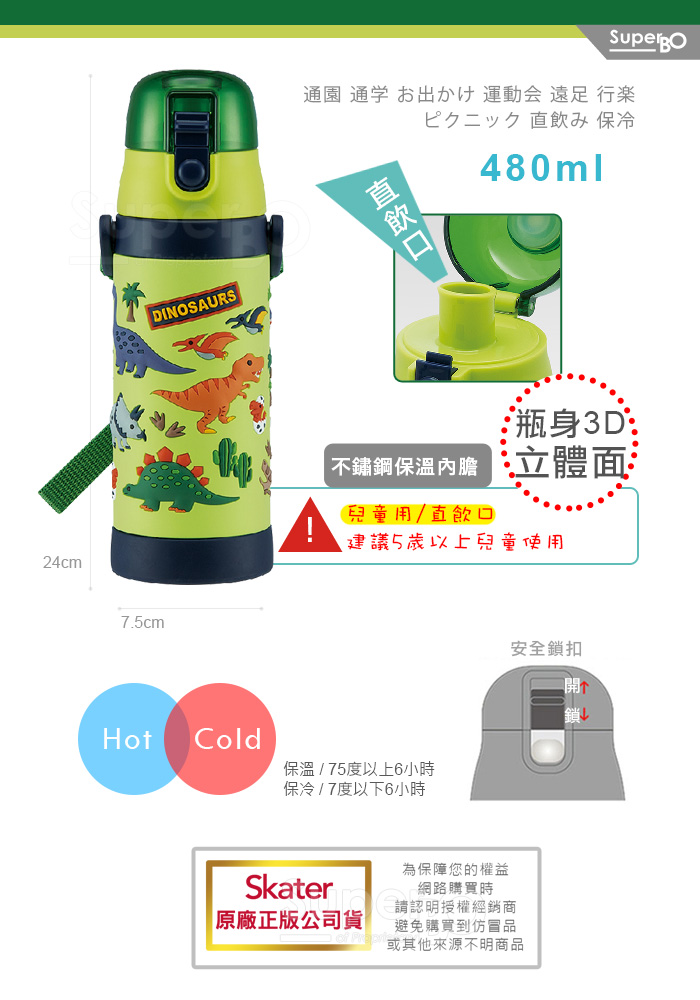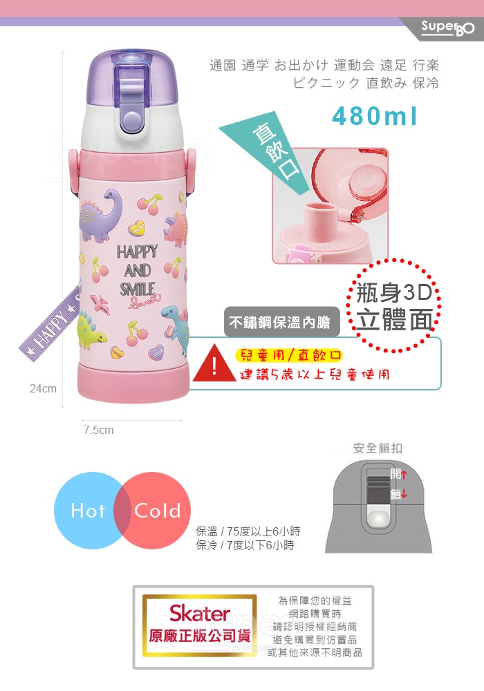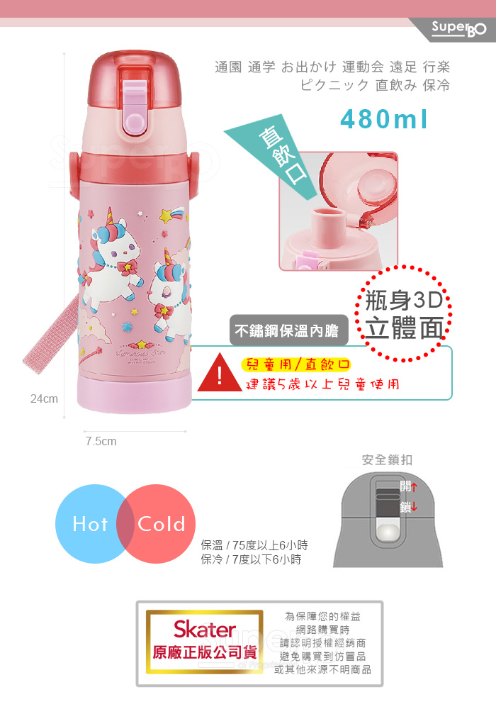 Skater 480ml 3D立體不鏽鋼保溫水壺|立體浮雕|超輕量不鏽鋼水壺|冰雪奇緣|獨角獸|粉粉龍|恐龍|閃電麥坤