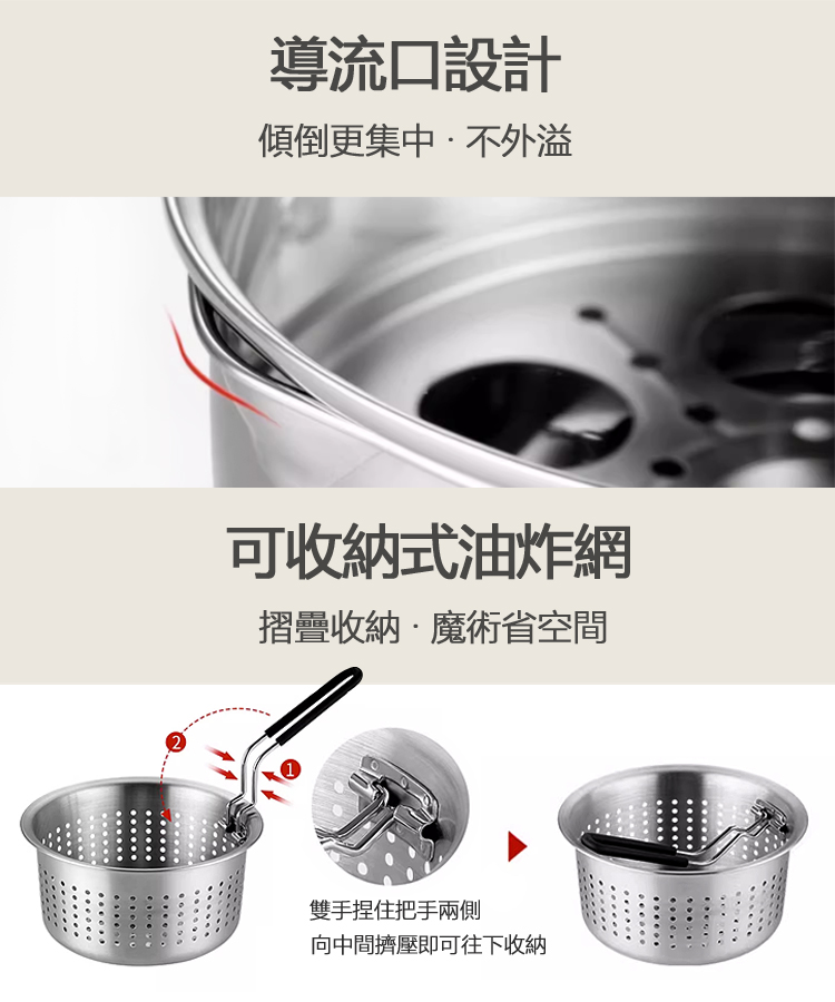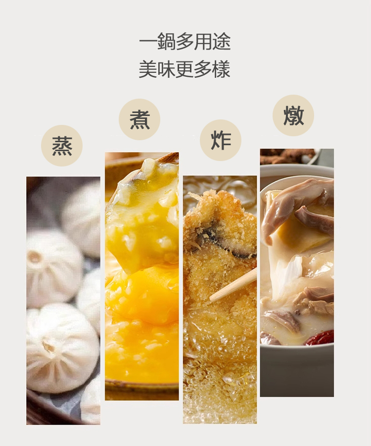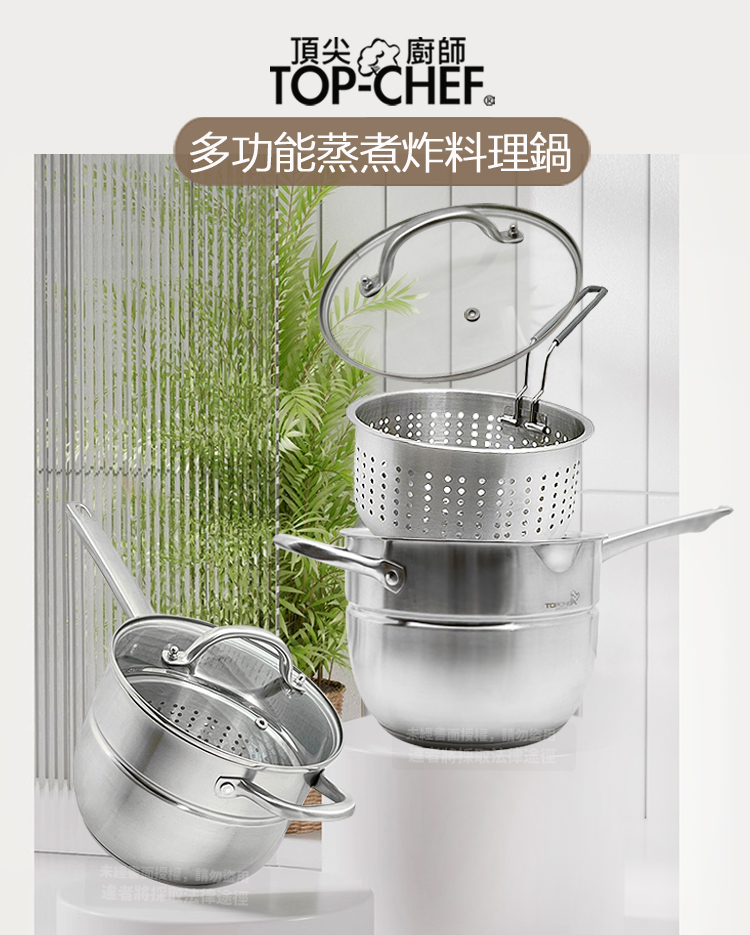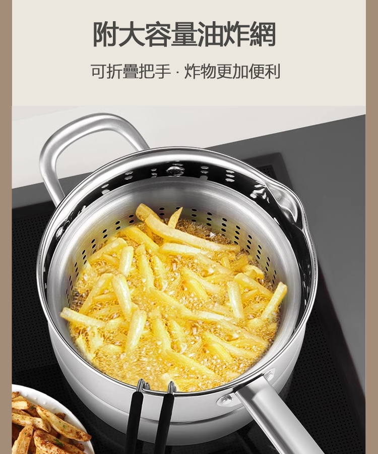 附蒸盤與多用途濾網,蒸煮炸一鍋搞定