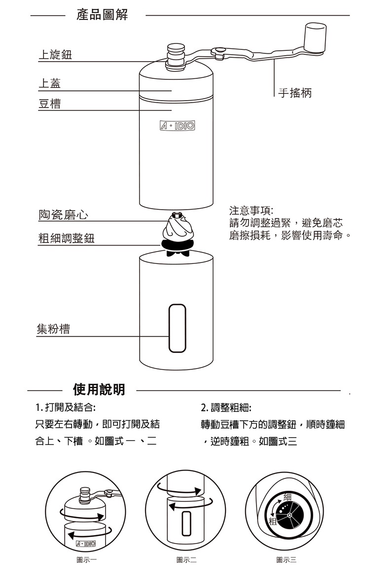 1.建議勿將調整鈕旋轉至過緊,避免加速陶瓷磨芯耗損,影響磨芯的使用年限。