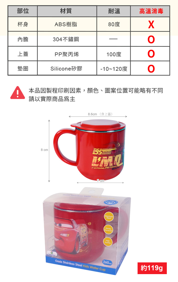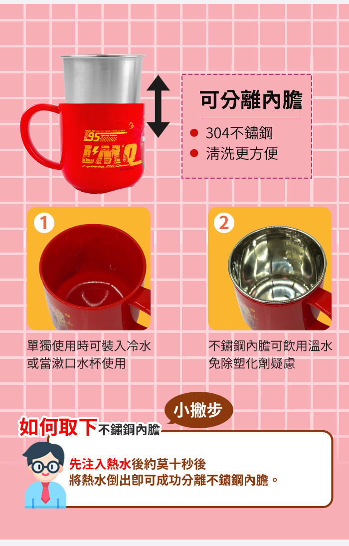 1.不鏽鋼內膽可單獨拆卸高溫消毒。杯身請勿使用洗碗機、紫外線消毒鍋及煮沸等方式消毒,可能會導致產品變形或圖案剝落。