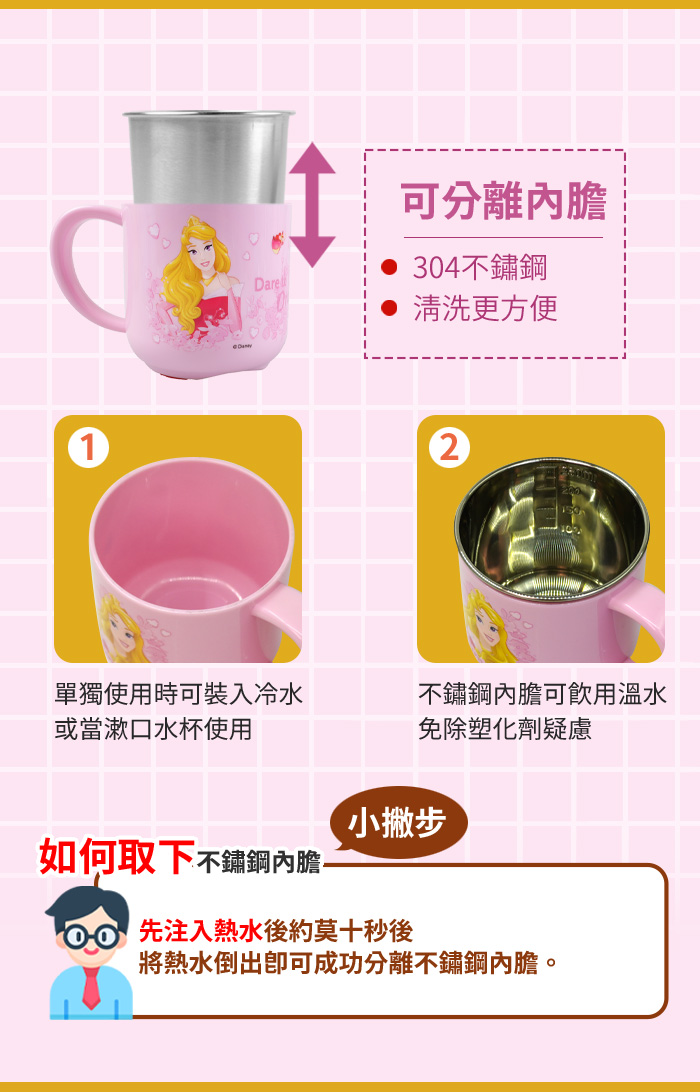 1.不鏽鋼內膽可單獨拆卸高溫消毒。杯身請勿使用洗碗機、紫外線消毒鍋及煮沸等方式消毒,可能會導致產品變形或圖案剝落。