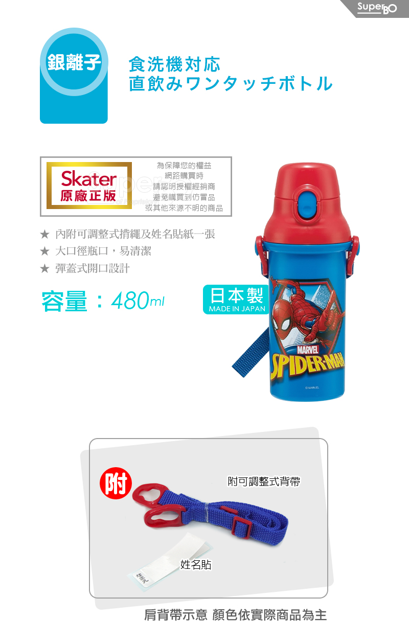 Skater 日本水壺 480ml 銀離子直飲水壺|蜘蛛人水壺|PSB5SANAG|直飲水壺|兒童水壺