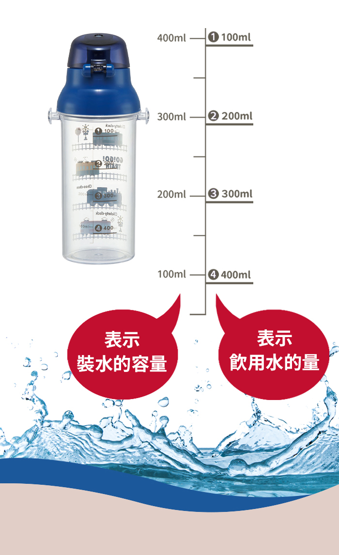 含有水量刻度的透明瓶身,方便查看瓶內水量,彈蓋式開口設計