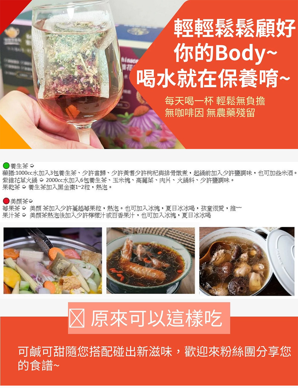 藥膳(限養生茶):每2~3茶包用1000 CC水,放入少許當歸、黃耆、枸杞不須取出茶包,放入排骨燉煮,可添加蔬菜。