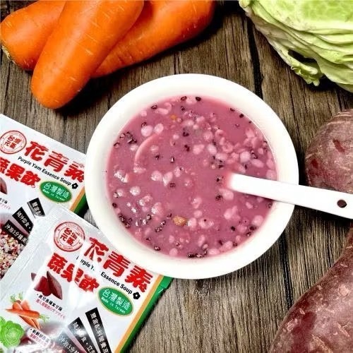 成份:紫心地瓜、小麥、植物油粉( 葡萄糖漿、棕櫚油、乾酪素鈉 )、燕麥、在來米、糙米、高麗菜、紅蘿蔔、鹽、紫米、甜菜根、關華豆膠、酵母抽出物、植物蛋白、胺基乙酸、胡椒、香菇。