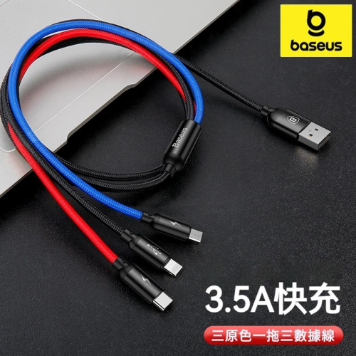 倍思 三原色 一拖三傳輸線 蘋果安卓 TypeC 3.5A 快充魚絲編織