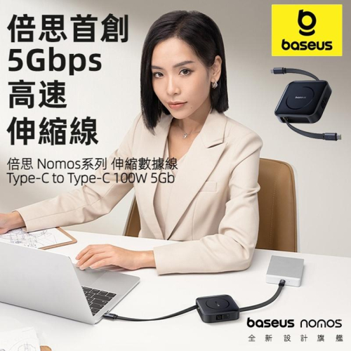 倍思 NOMOS伸縮線 100W TypeC to TypeC 5Gb 雙頭磁吸 三檔線長 便攜 1M