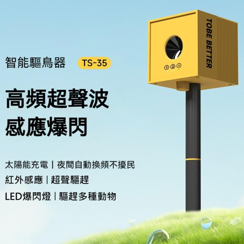 ibits TS35 太陽能超聲波驅鳥器 【產品亮點】 1. 內建高頻喇叭,釋放高頻超音波效果更強。 2. 內建強光爆閃燈,閃光方式驅趕動物。 3. 內建紅外線感測器,感應到動物進入限定範圍會觸發超音波與爆閃燈。 4. 內建1200mAh鋰電池,續航力10天以上。 5. 可太陽能充電,長期不需打理。 6. 極具人性化的檔位設計,日夜檔位時,會自動在夜間調整為低幹擾的聲波,夜間不擾民。 7. 多種場景可使用,戶外農地也可以安裝。 ------------------------------------------------------------- 產品參數 品名:太陽能超聲波驅鳥器 紅外感測角度/距離:110°/10米 型號:TS-35 電池容量:1200mAh(鋰電池3.7V) 充電方式:Type-C/太陽能充電 聲波頻率:13-60KHz #ibits #TS35 #太陽能 #超聲波 #驅鳥器 #戶外 #動物驅趕器 #LED強光 #貓狗驅逐 #紅外線感應 #IP56防水 #趕鳥神器