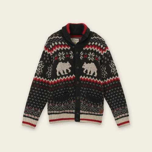 保暖舒適的開襟毛衣加入經典的費爾島針織花紋及手肘處的撞色拼接設計,寬鬆版型使得穿著體驗更加分。