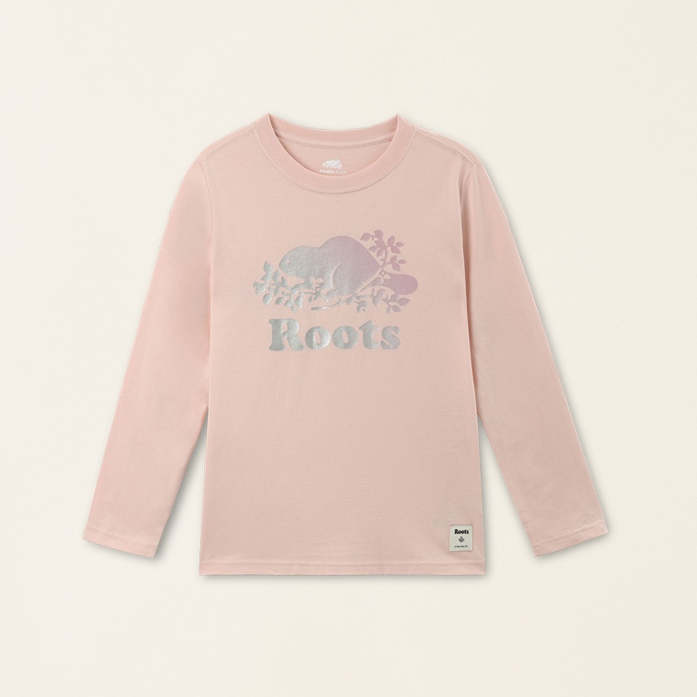 Roots經典有機棉長袖T恤於胸前加入漸層亮粉海狸LOGO,為寶貝的日常風格增添繽紛活力。