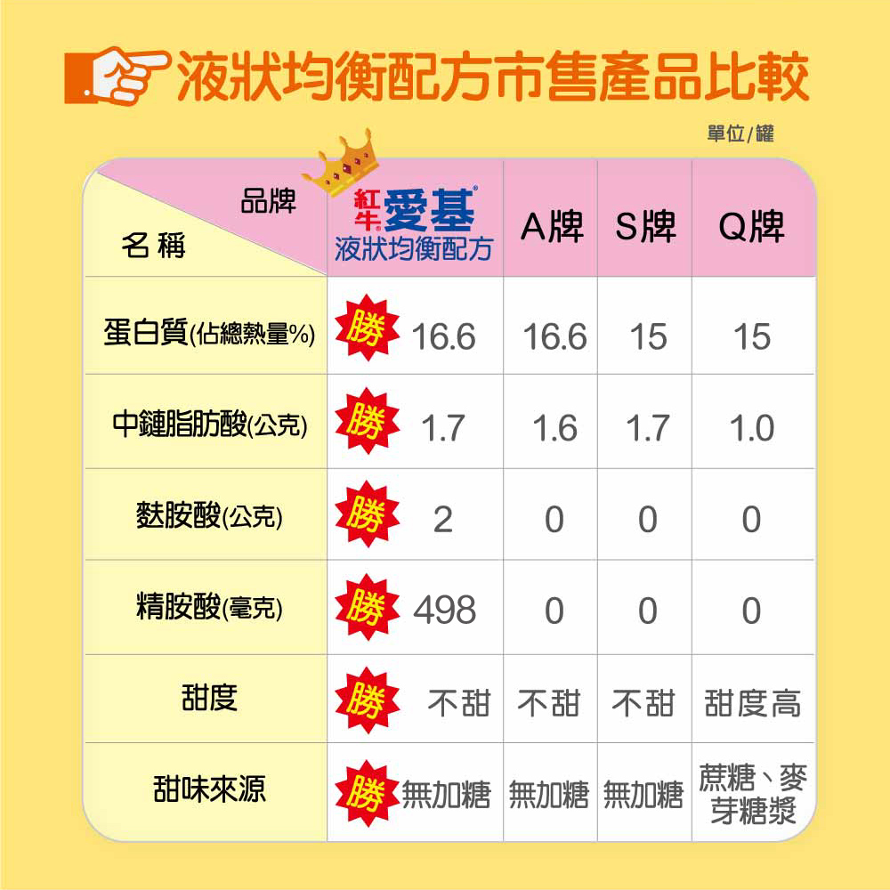 成分:水、麥芽糊精、芥花油、乾酪素鈉、乾酪素鈣、分離大豆蛋白、中鏈三酸甘油酯、檸檬酸鈣、大豆卵磷脂、乳酸硬脂酸鈉、脂肪酸甘油酯、重酒石酸膽鹼含二氧化矽、磷酸氫二鈉、氯化鉀、磷酸氫二鉀、香料、維生素C、氧化鎂、磷酸鈣、牛磺酸、葡萄糖酸鋅、鹿角菜膠(含葡萄糖)、維生素E(含辛烯基丁二酸鈉澱粉、麥芽糊精、二氧化矽)、焦磷酸鐵、菸鹼醯胺、葡萄糖酸錳、碳酸鈣、本多酸鈣、葡萄糖酸銅、維生素B6、維生素A(含糖、玉米澱粉、阿拉伯膠、抗氧化劑維生素E、磷酸鈣)、維生素B12、維生素D3(含麥芽糊精、辛烯基丁二酸鈉澱粉、糖)、維生素B1、β胡蘿蔔素、維生素B2、維生素K1(含澱粉)、葉酸、生物素、鉬酵母、硒酸鈉、碘化鉀。