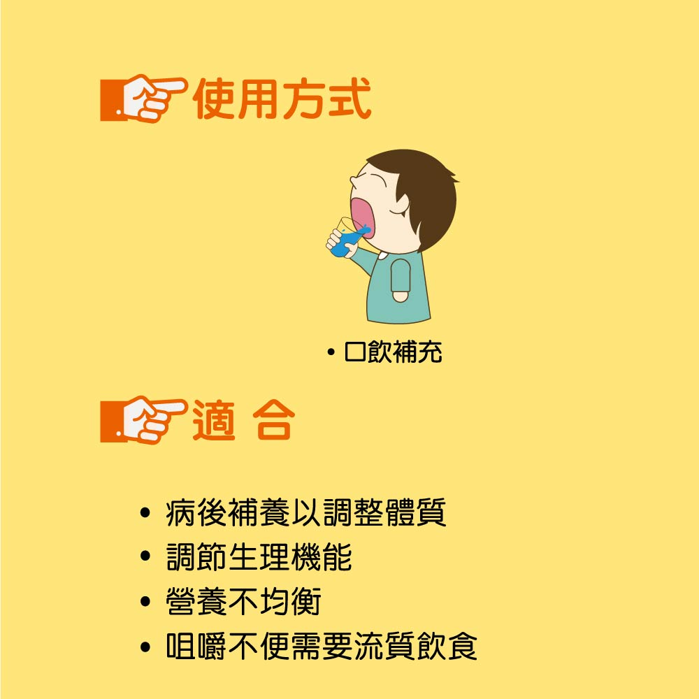 3. 本產品適合口飲營養補充,每日建議飲用1~2罐。