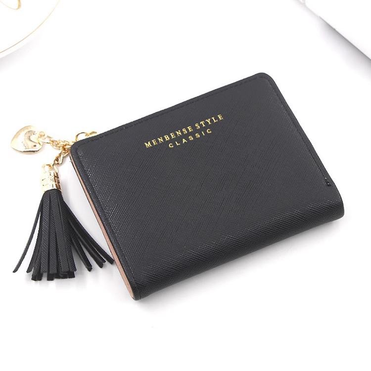 韓款 ins 簡約 耐刮 十字紋 輕薄款 流蘇 零錢包 折疊 配色 短夾 - 粉色、黑色