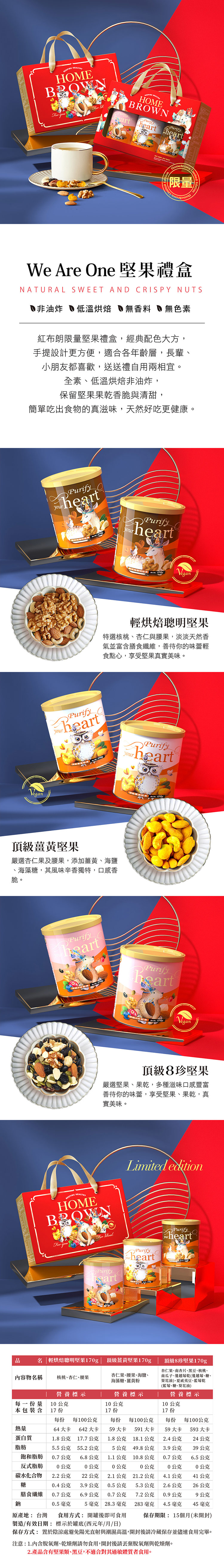 ❤紅布朗嚴選優質的堅果原料,且因堅果油脂含量高的特性,在包裝上使用乾燥劑+脫氧劑+鐵罐保存,由專業HACCP及ISO22000工廠製造,讓消費者買到安心不變質的堅果,吃得到新鮮、多種營養素與原始風味。