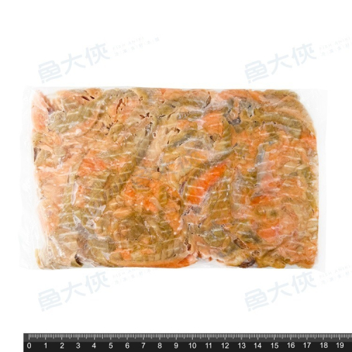此為鮭魚取完整片清肉後,靠近上背肉的部分在取下的背肉條,