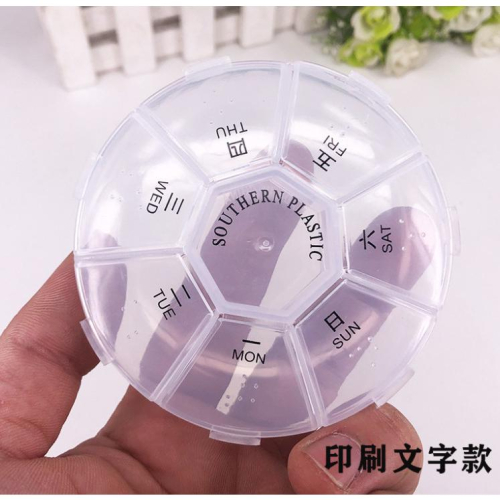 商品名稱:隨身七日藥盒 尺寸:直徑約9CM x高度約2CM 材質:PP 重量:8.5g 產地:中國