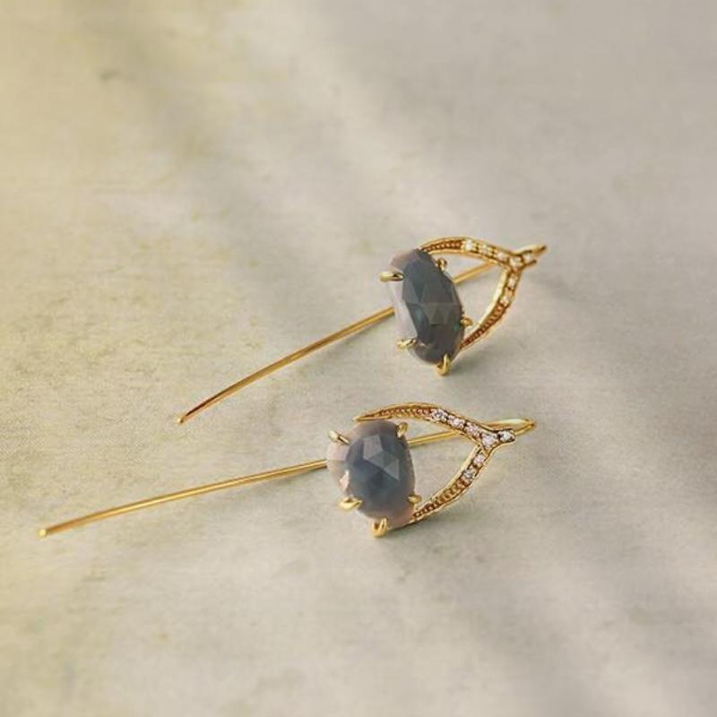 CEDONY|優雅氣質 設計感 拉長石 不規則曲線切割 冷灰色基調 藍色光暈 弧形線條 鑲嵌白鋯石|耳環 長耳勾 耳勾