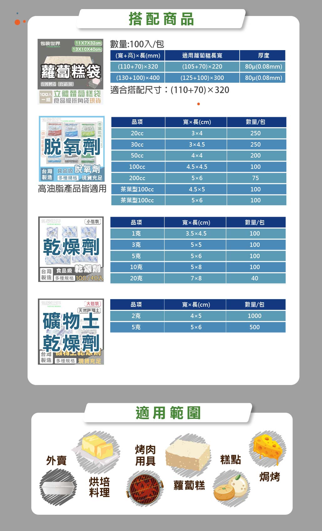 料理烘焙、烤肉用具、中式傳統糕食、戶外野炊、外賣餐飲等。