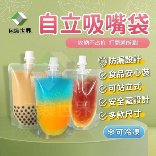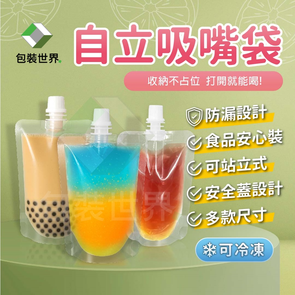 自帶吸嘴的飲料袋,底部加寬設計,不僅加大容量,也方便站立、展示商品,材質耐用防漏、可於-20°C保存,讓您安心裝食品!