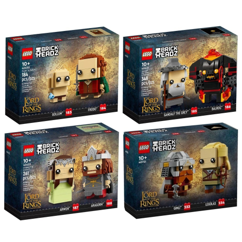 本次的魔戒 BrickHeadz 雙人包目前有「40630 佛羅多與咕嚕」、「40631 灰袍甘道夫與炎魔」、「40632 亞拉岡與亞玟」40751 勒苟拉斯&金靂 零件數的話 40630 共有 184 片,另外三款基本上應該相去不遠!這次的四款每個都是經典組合