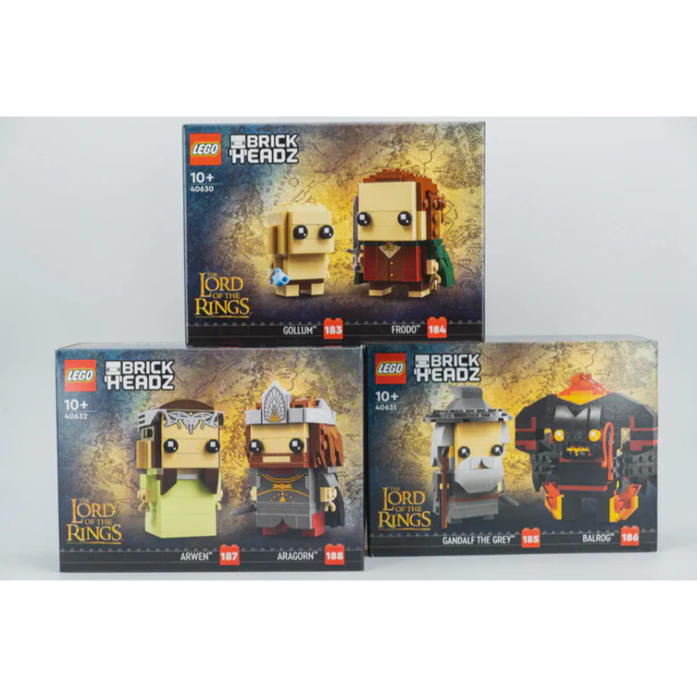 本次的魔戒 BrickHeadz 雙人包目前有「40630 佛羅多與咕嚕」「40631 灰袍甘道夫與炎魔」、「40632 亞拉岡與亞玟」 零件數的話 40630 共有 184 片,另外兩款基本上應該相去不遠,預計會在 2023 年發售!這次的三款每個都是經典組合
