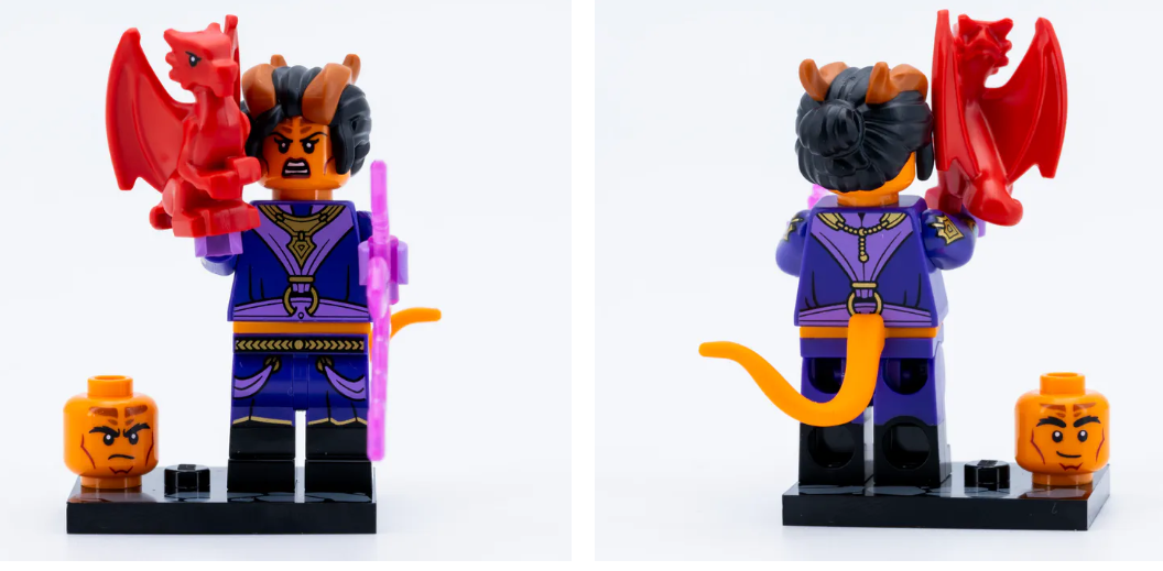 提夫林巫師 (Tiefling sorcerer) 包含樂高 (LEGO)提供的所有元素。同樣,兩個頭,一條新的龍,一個新的閃電咒語效果,一個新的雙模假髮,新的雙模腿,以及手臂、軀幹和腿部上精美細緻的印花。