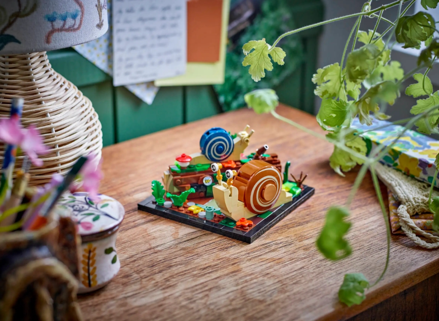 本作一共有 264 片零件,組完之後方形底座的長寬大約是 13 公分,內容包含兩隻殼上有漩渦圖案的蝸牛、施以蜜蜂印刷的 1×1 透明小圓零件、堆砌樣式的圓木、綠色的小水窪跟黏液等,蝸牛也可以自由取下、隨意擺放把玩,小編個人認為殼的零件擁有很大的創造潛力啊!