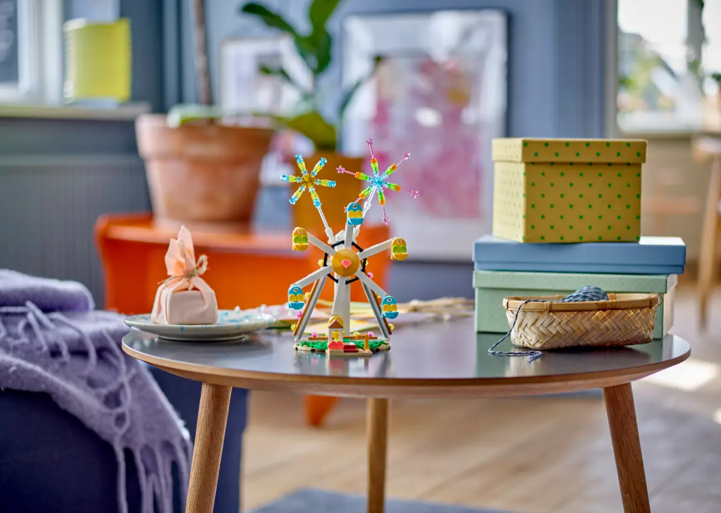 遊樂園玩具包含 6 個座艙和 1 顆愛心-愛心是所有樂高慶祝系列產品的代表符號。孩子可轉動背面的小型機械裝置,讓摩天輪旋轉。色彩繽紛的煙火由透明零件組成,可擺在摩天輪上方或側面展示。