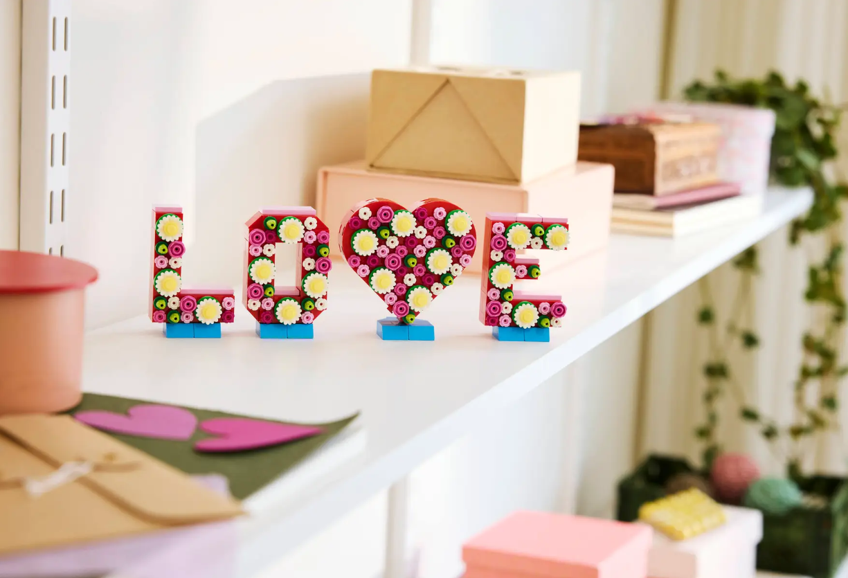 色彩繽紛的展示品-此樂高® 盒組包含由粉紅色積木組成、立於藍色底座上的字母,並能以各式花朵配件加以裝飾,打造出吸睛的擺飾