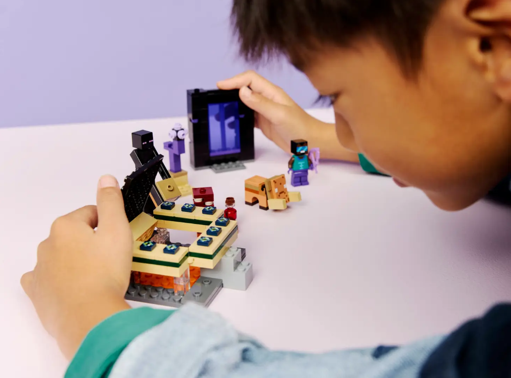 3 個角色、2 個傳送門-啟動這款玩具的傳送門並走過去,發現各個生態域的樂高® 模型,跟酷炫英雄人偶、終界使者和疣豬獸寶寶玩偶一起展開 Minecraft® 動作冒險