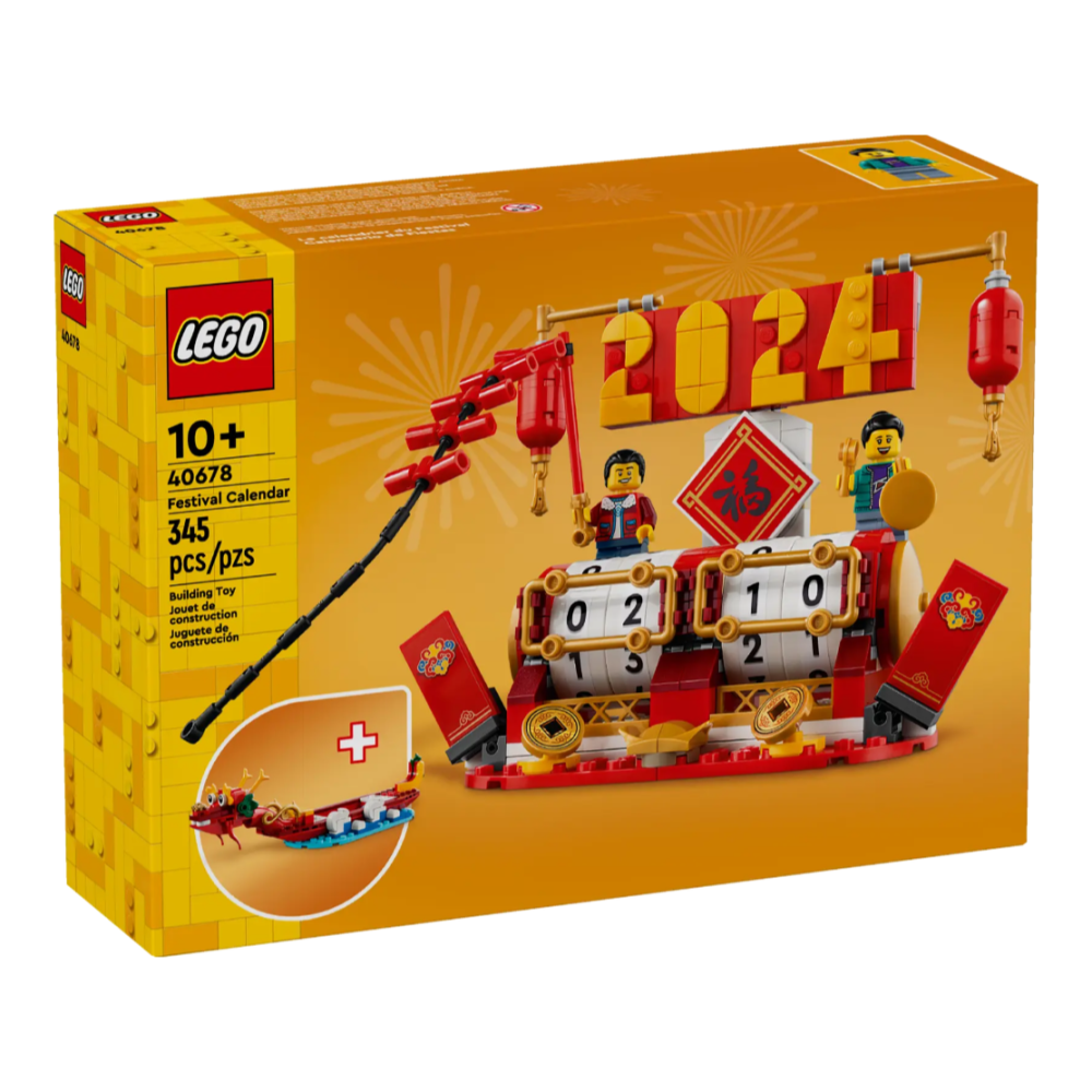 樂高® 桌曆是歡慶不同季節佳節的絕佳方式。這款樂高® 節慶桌曆(40678)適合 10 歲以上孩子,提供 2 種有趣的拼砌選擇。桌曆也可轉動,讓孩子能選擇要呈現的日期。新春拼砌選項包含 2 隻人偶與燈籠配件。端午節拼砌選項有美麗的龍頭和龍尾,以及水的零件。其他獨具意義的配件包括鞭炮、紅包袋和象徵福氣的牌子。