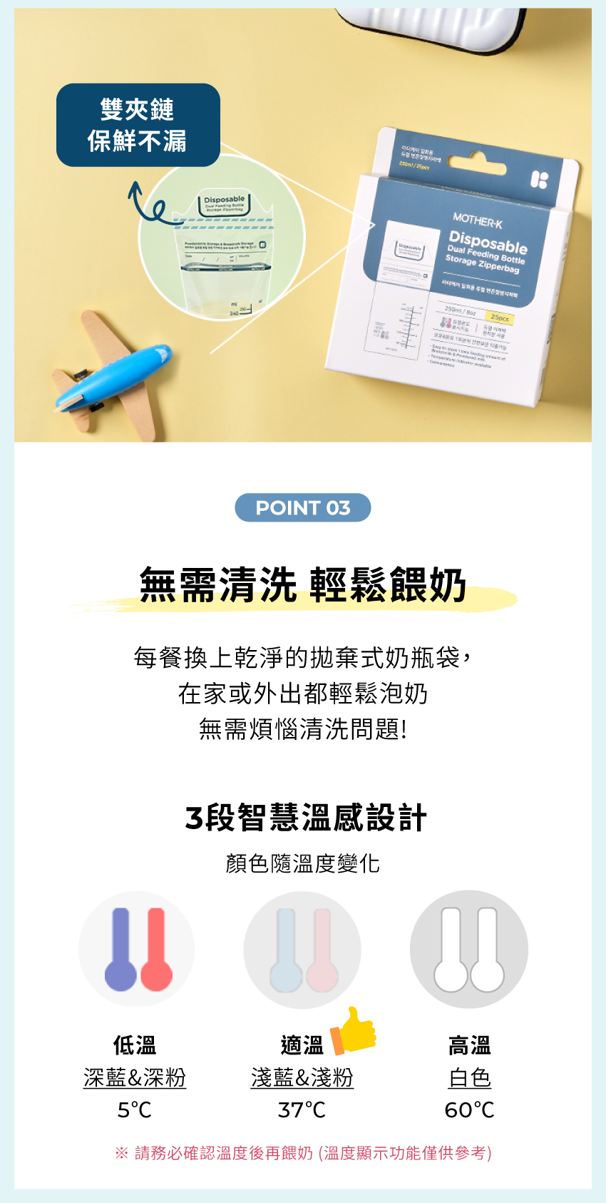 - 2.使用時將奶瓶袋打開•倒入溫水混合後再用指壓住封口
