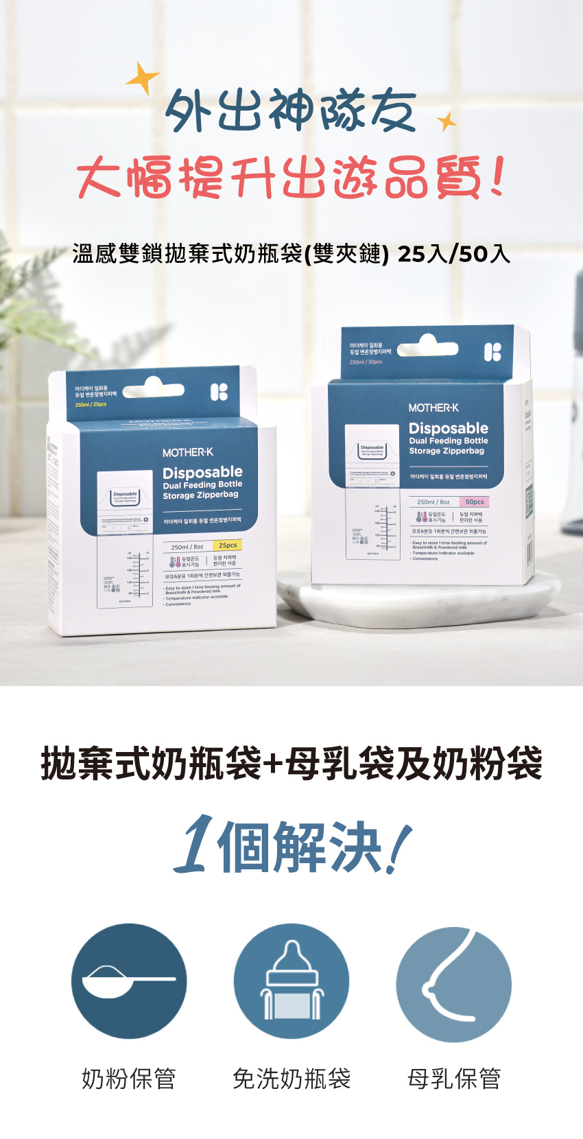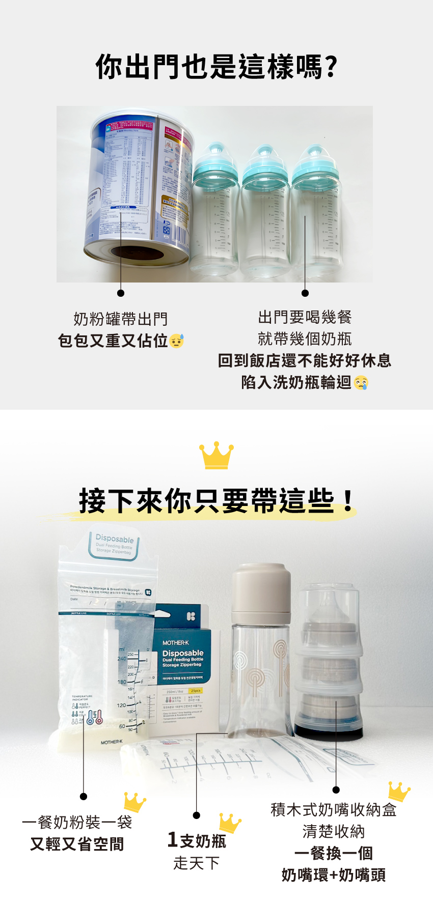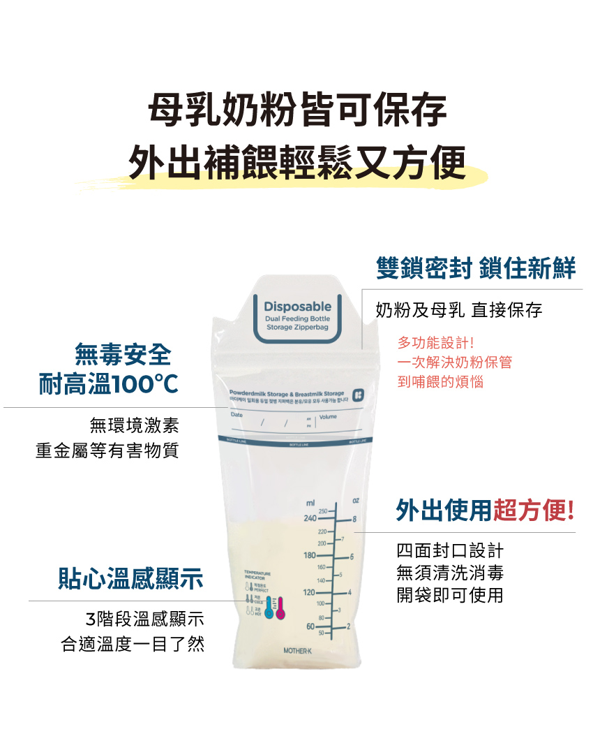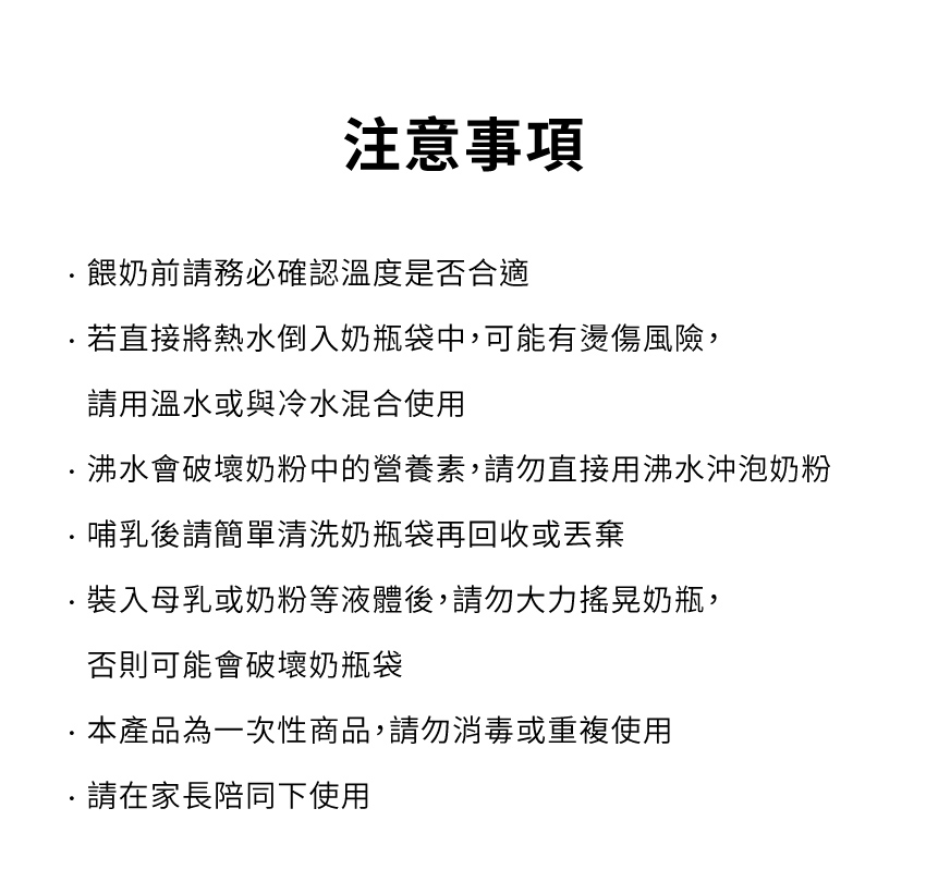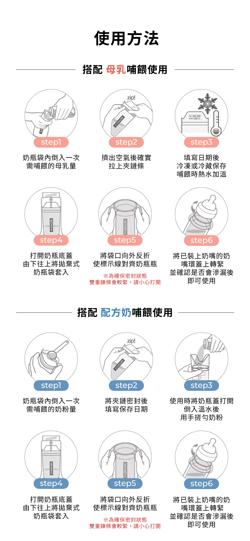 - 1.奶瓶袋內存放一次需哺餵的奶粉量後將夾錬密封