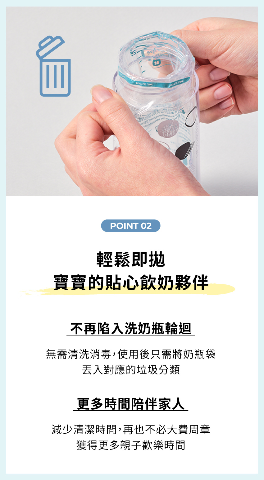 另外,奶瓶袋套入奶瓶內難免會有一些皺褶, 如果擔心這樣水量不準, 可以先不要套進奶瓶, 先把水加入奶瓶袋內與奶粉混勻之後, 再從奶瓶底部將奶瓶袋套上奶瓶。