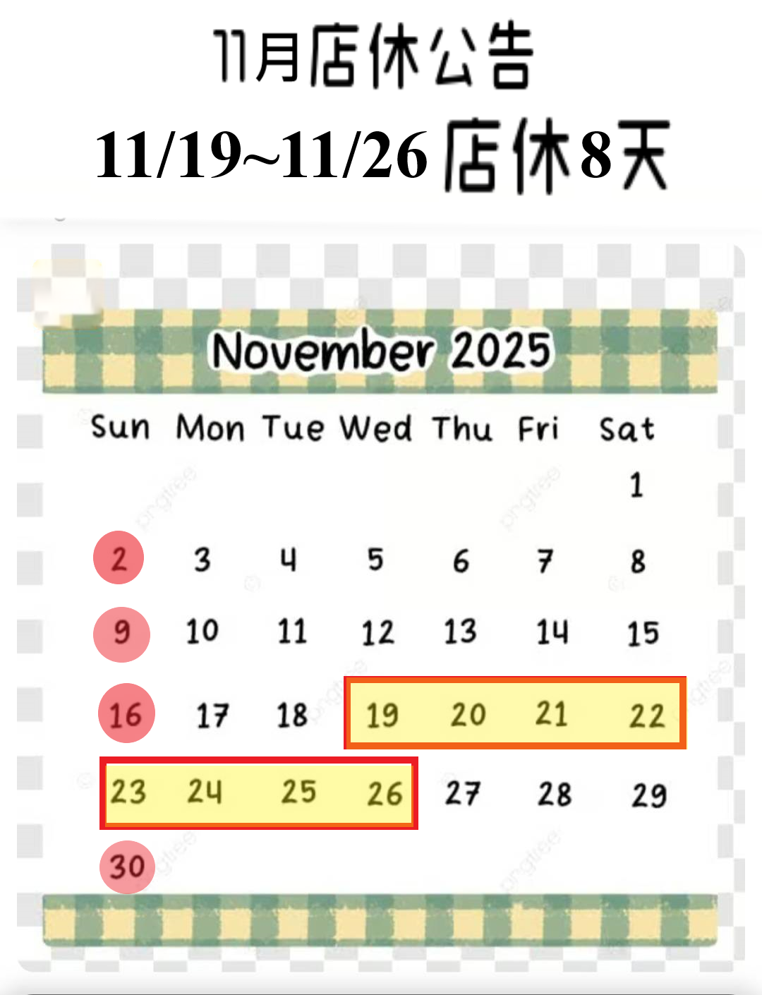<p>11/19~11/26店休,因為目前訂單已滿,所以11/17會提前關閉賣場不在接單喔!11/27正常上班出貨,謝謝</p>