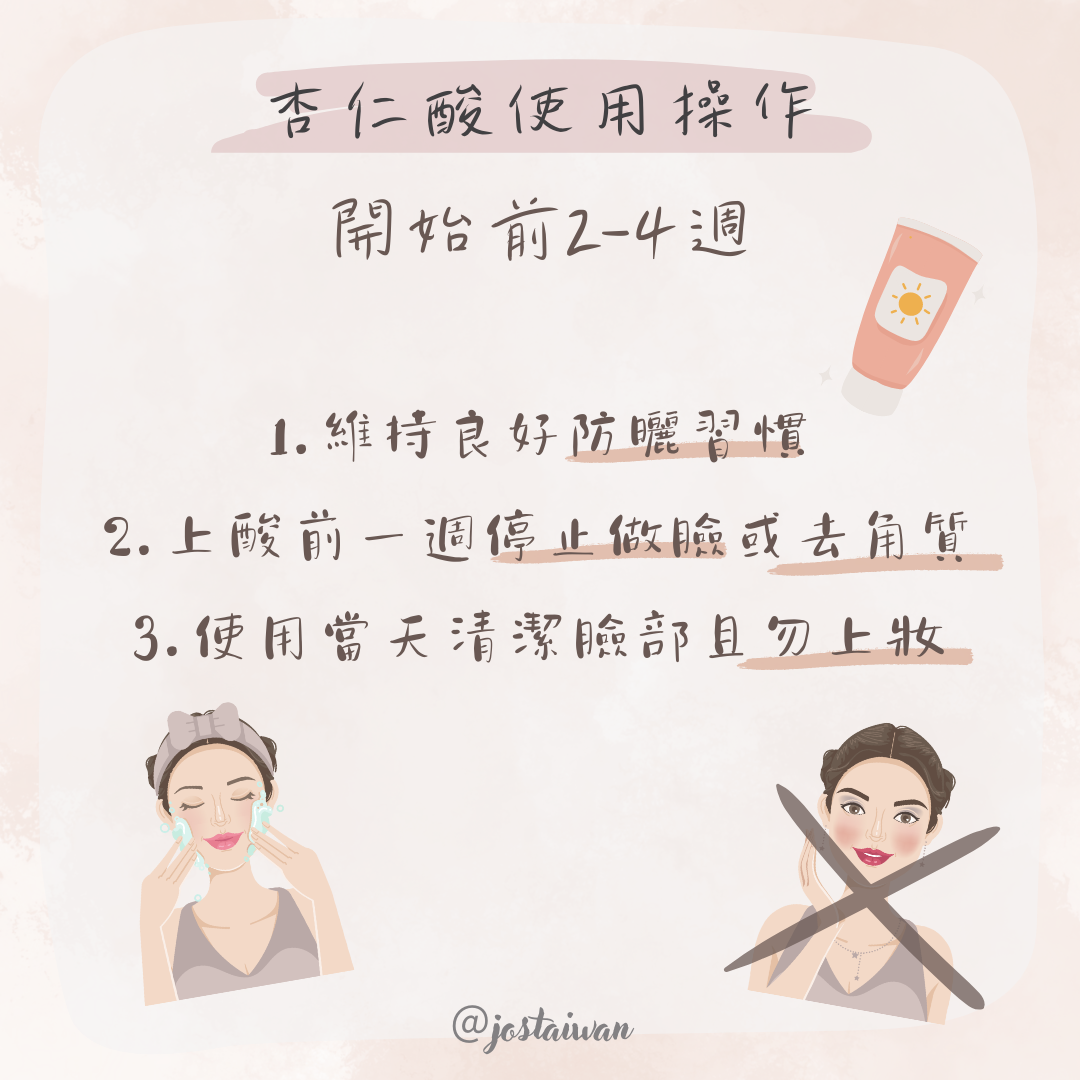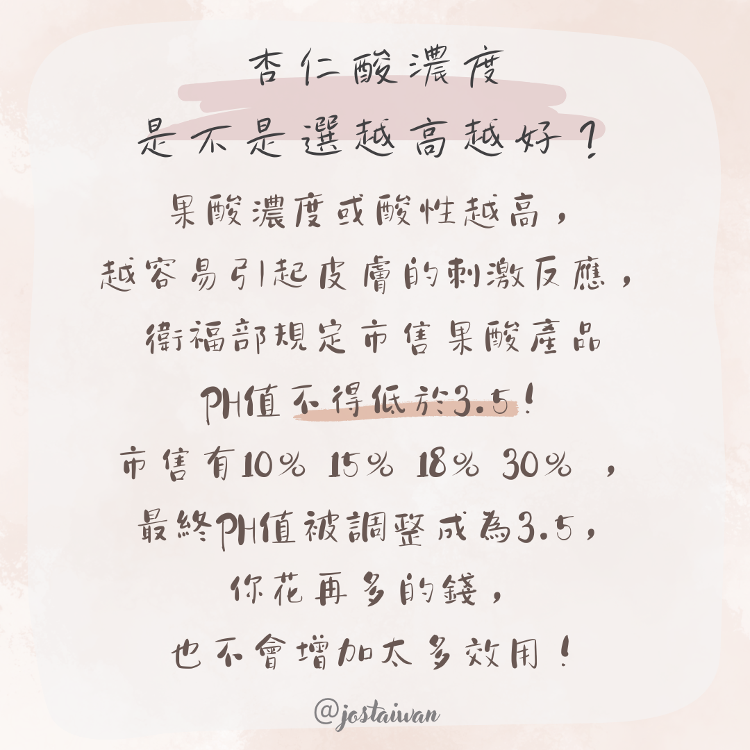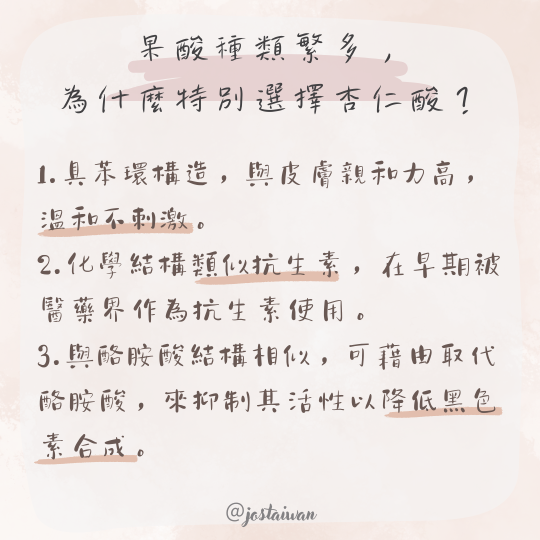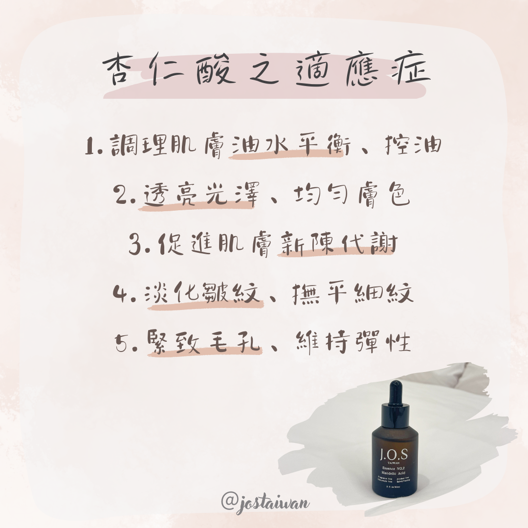 ———以下內容純屬科學教育,非營利行銷文宣——— 杏仁酸(Mandelic Acid)是目前唯一具有苯環構造的酯溶性果酸,與皮膚親和力高,分子比甘醇酸約大兩倍,對皮膚較為溫和不刺激。且杏仁酸化學結構類似抗生素,在早期被醫藥界作為抗生素使用。 杏仁酸與酪胺酸(合成黑色素)的結構相似,因此可以藉由取代酪胺酸,來抑制酪胺酸酶的活性以降低黑色素合成。 杏仁酸之適應症狀 1.調理肌膚油水平衡、平衡肌膚油脂分泌、控油 2.透亮光澤、均勻膚色 3.促進肌膚新陳代謝 4.淡化皺紋 撫平細紋 5.緊緻毛孔 維持彈性 杏仁酸使用操作 開始前2-4週 1.維持良好防曬習慣 2.上酸前一週停止做臉或使用磨砂膏/去角質產品 3.使用當天清潔臉部且勿上妝 操作步驟 1.清潔皮膚:去除表皮的油質和皮屑,增加杏仁酸的滲透力,使分佈均勻。 2.觀察感受皮膚狀態,可連續使用2-3天,是否產生脫皮脫屑等代謝現象。 3.肌膚約28天會代謝角質一次 無需過度使用酸類 每週一次療程即可(局部操作者除外) 4.如有成功代謝,即可休息停用,要格外注重保濕及防曬 5.大約需要5-10次的煥膚療程才能達到滿意的效果