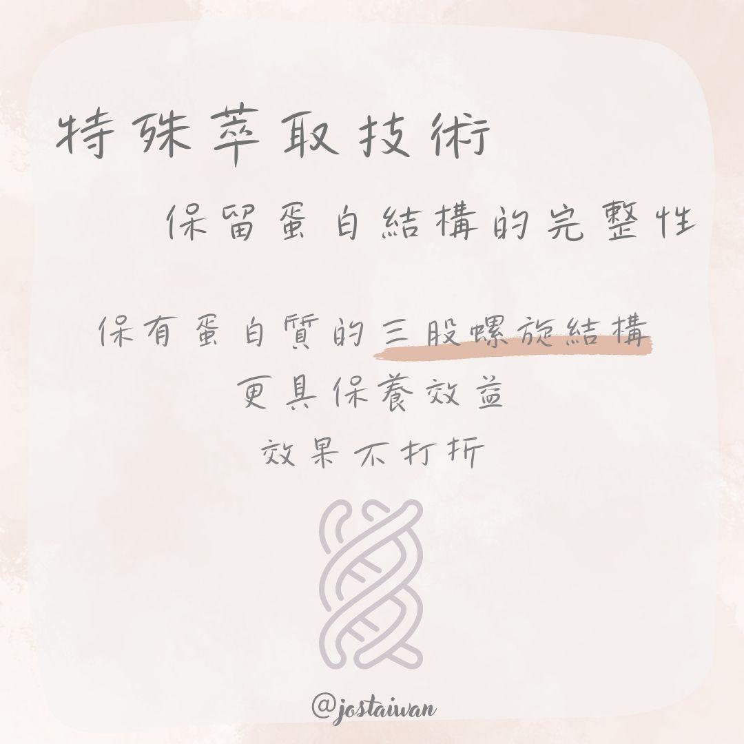 小分子肽含量占比高達87% 原料來源:加拿大 透過專利酶解技術萃取 因為特殊的萃取技術 使得蛋白質仍保有三股螺旋結構,更具保養效益。
