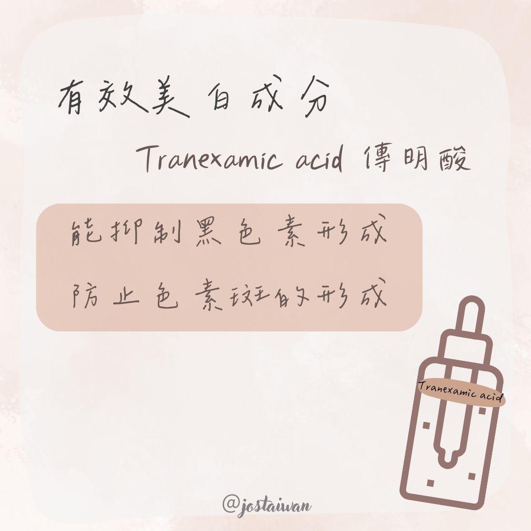 Tranexamic acid 傳明酸:能抑制黑色素形成及防止色素斑的形成。