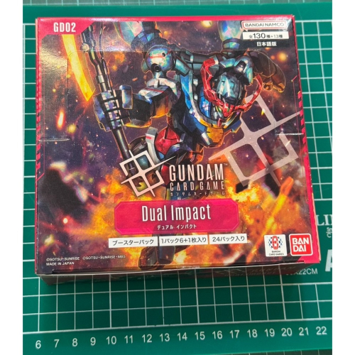 - 《鋼彈卡牌 GCG 雙重衝擊 GD02》是一個包含130種以上卡牌的擴充包,內含普通、罕見、稀有、傳說稀有、替代和能源卡牌,總計143張卡牌。它包含兩組主題牌組:「AGE×Wing」和「幽谷×地球聯合」。產品內容